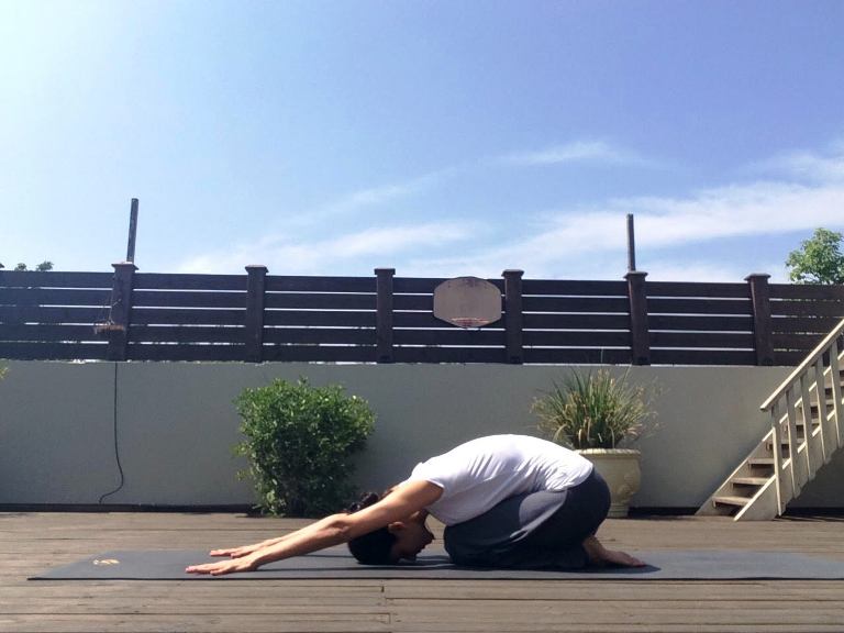 4. בסיום התרגיל הקודם תסיעו את האגן לאחור ותאריכו את הידיים לפנים, תניחו את המצח למזרון ותאריכו את עמוד השדרה.