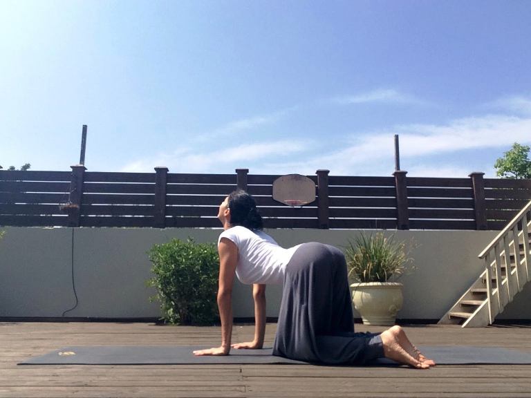 3. תנועתיות בעמוד השדרה- עימדו בעמידת שש עם מרפקים ישרים בשאיפה תקערו את הגב כמו קערה הסנטר והאגן נעים כלפי חוץ מעלה ובנשיפה קמרו את הגב כשהסנטר והאגן נעים פנימה מטה. חיזרו על המחזוריות בין 5 ל 10 פעמים.