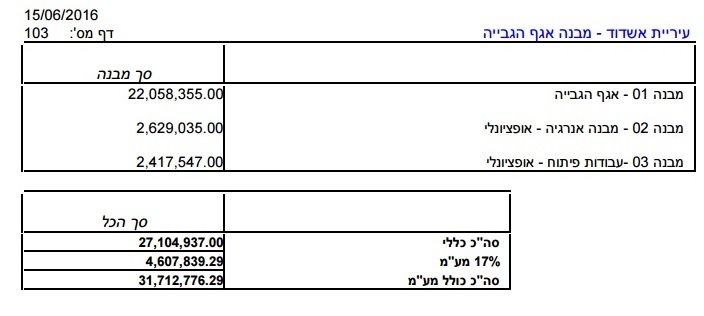 הערכת עלות הבניה על פי המכרז שפירסמה עיריית אשדוד: