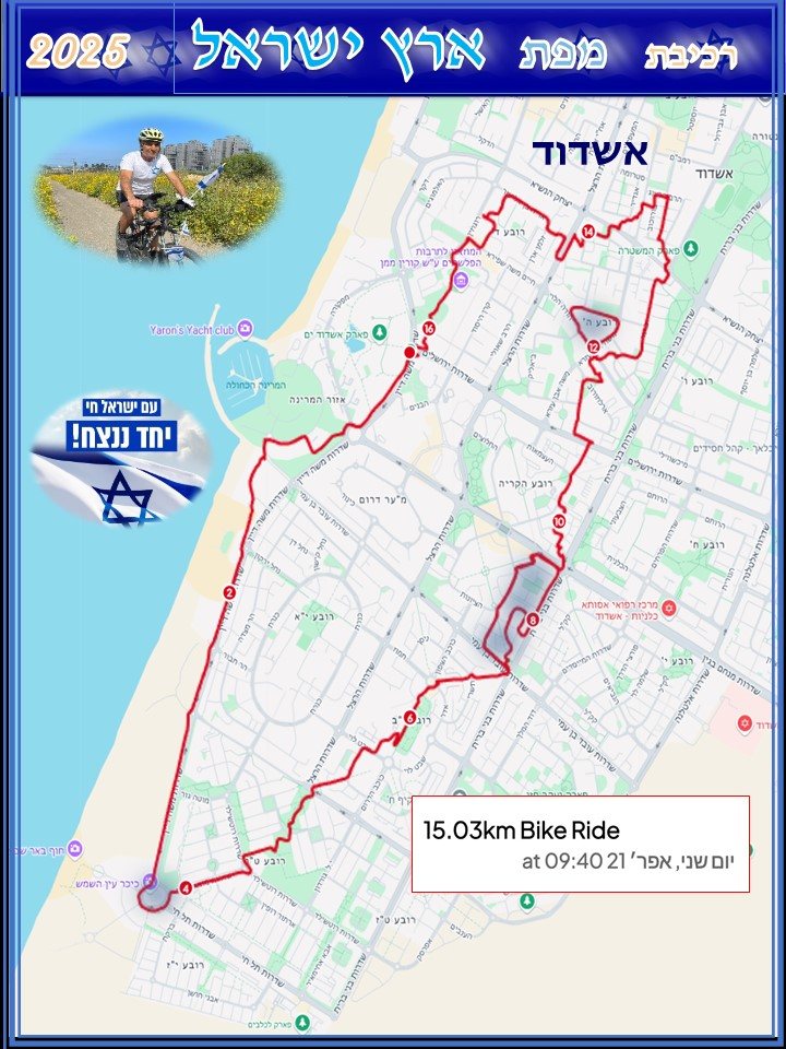 "חברים שאלו אותי למה זמן רב לא ראינו את המסלולים שלך? לקחתי לתשומת ליבי ונעניתי לבקשה... היום רכבתי ברחובות העיר אשדוד כ-15 ק"מ במסלול הכי רלוונטי להיום – אשר יצר את מפת 'ארץ ישראל' היקרה והאהובה שלנו" נתפלל לשלומם והצלחתם של חיילנו הגיבורים, נייחל להחזרת החטופים ולהחלמתם המהירה של הפצועים.