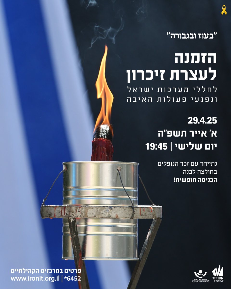 ביום שלישי, 29.4 א’ באייר תשפ"ה 20:00, תתייחד אשדוד עם זכר בניה ובנותיה – חללי מערכות ישראל ונפגעי פעולות האיבה.הטקסים והעצרות ברחבי העיר יעמדו בסימן "עוז וגבורה" – מחווה לגבורתם של הנופלים והנופלות, בני ובנות העיר, שמות מוכרים ויקרים שלעולם לא נשכח. אנו מזמינים אתכם להיות חלק מהמרחב הזוכר, להתאסף, לשיר, לשתוק ובעיקר להיות יחד