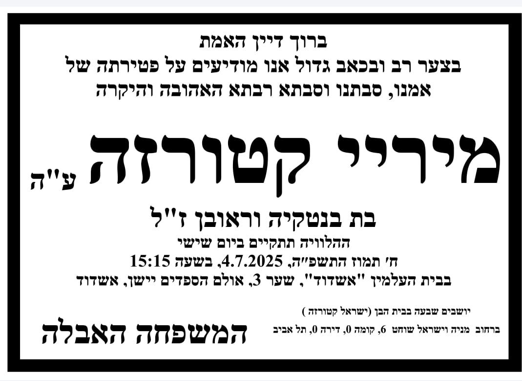 האישה הצדקת מיריי קטורזה, מוותיקות העיר אשדוד, הלכה לעולמה והובאה הצוהריים למנוחת עולמים בבית העלמין באשדוד.