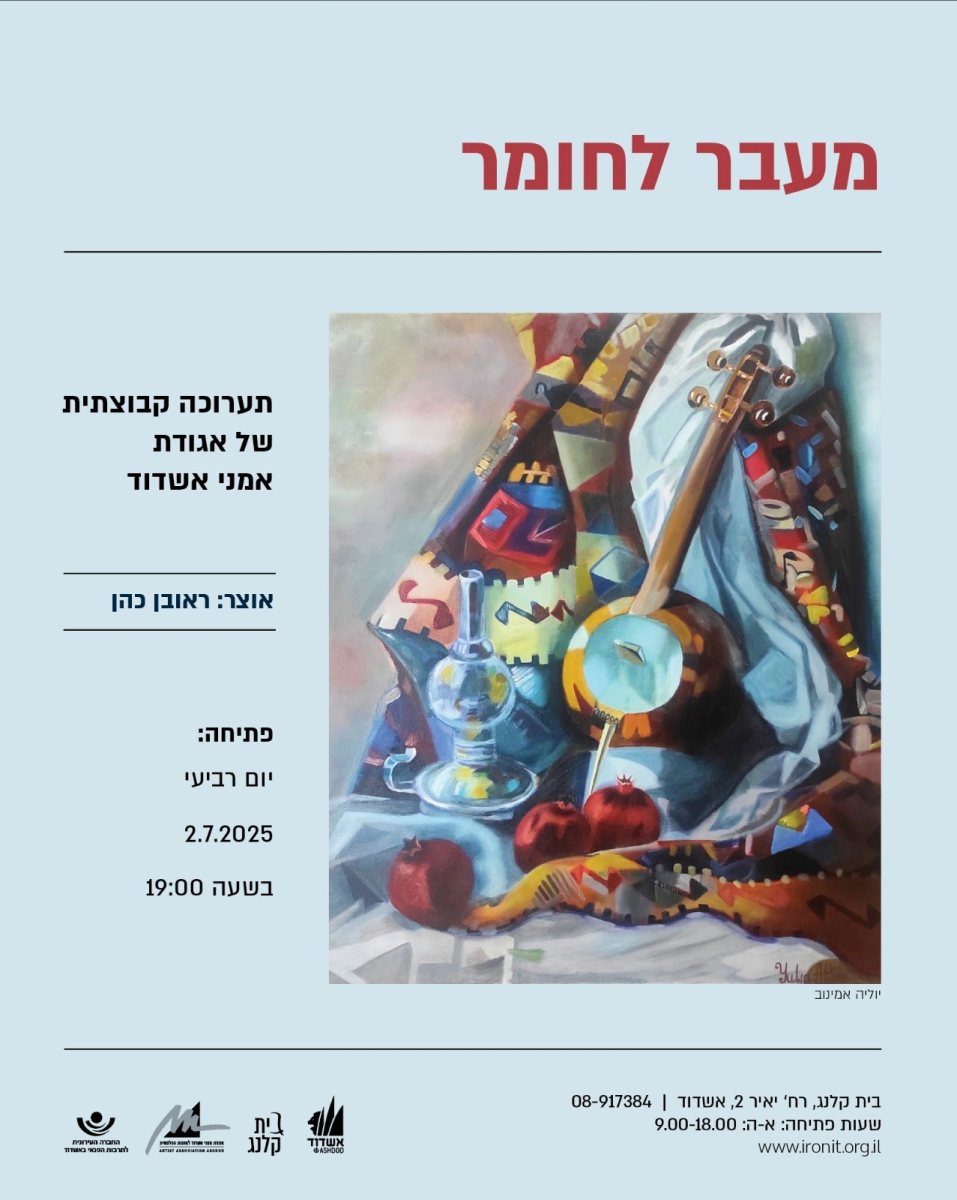 ב־2 ביולי תיפתח בבית קלנג באשדוד התערוכה הקבוצתית החדשה של אגודת אמני אשדוד לאמנות פלסטית – "מעבר לחומר". התערוכה תציג יצירות של 55 אמנים ואמניות, שייקחו חלק במסע אמנותי החוקר את המשמעויות הנסתרות שמסתתרות מאחורי חפצים פשוטים, דוממים לכאורה.