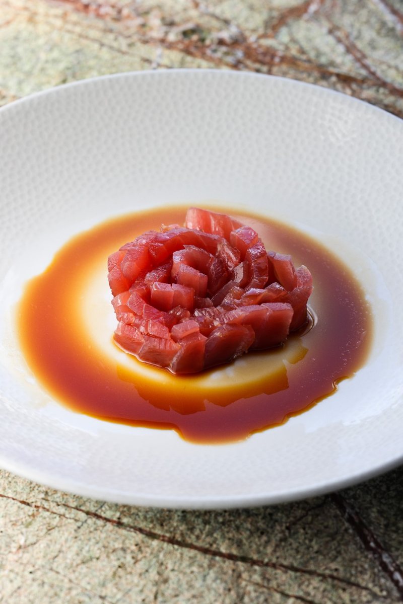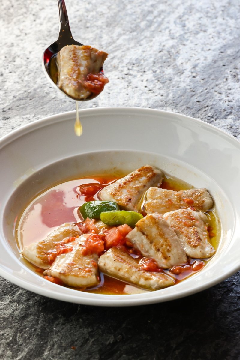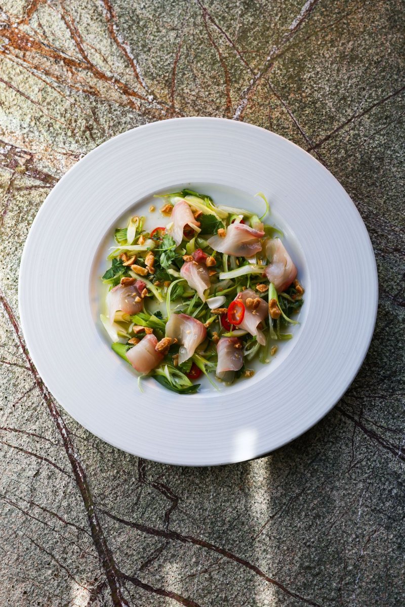 "המנה הזאת היא שיר אהבה לאוכל רחוב ישראלי – עם חומוס, צ’יפס, פטרוזיליה, אריסה ודג קונפי ברוטב שמן זית. כל ביס – חתיכת זהות."שקדים חריפים