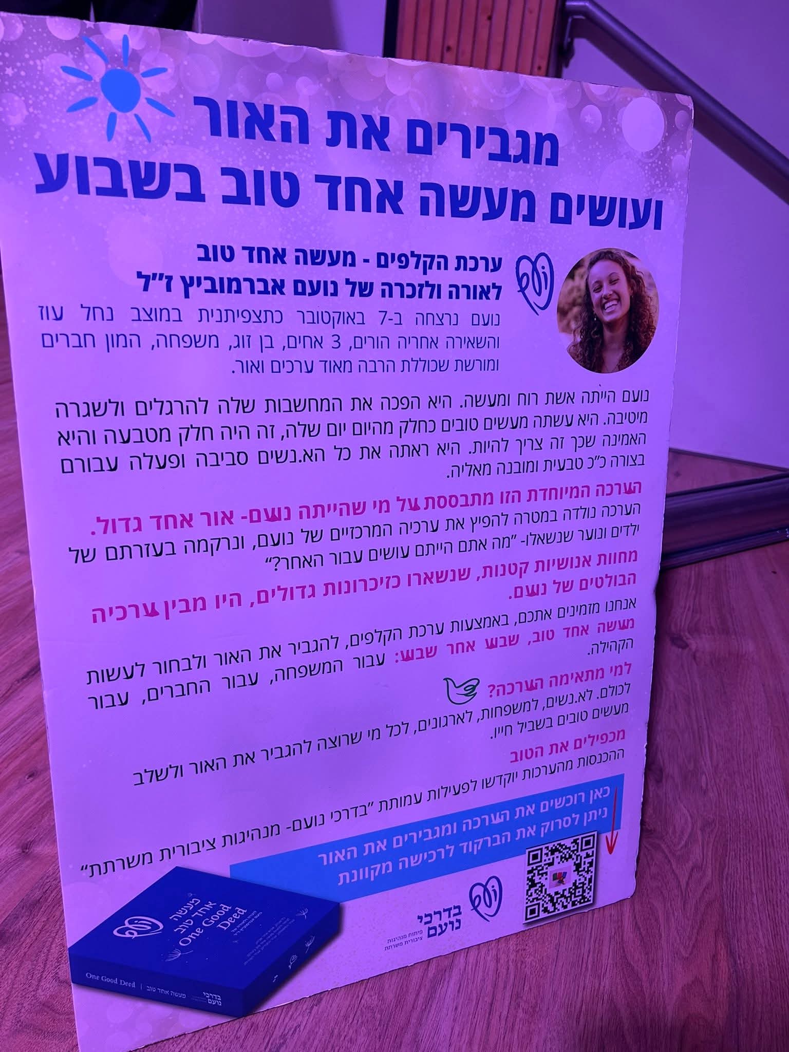 במהלך הערב הוצגה גם ערכת הקלפים החינוכית "מעשה אחד טוב", שנוצרה לזכרה של נועם. הערכה מזמינה ילדים, בני נוער וקהילות לבצע פעולה טובה אחת בשבוע, ולהמשיך בכך את דרכה של נועם דרך של חמלה, הקשבה, אור ונתינה.