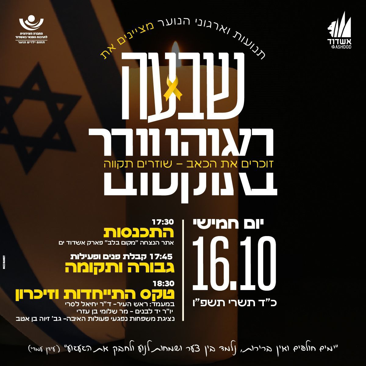 בטקס יונצחו 48 הנופלים והנופלות בני העיר אשדוד, שנרצחו ונפלו מאז השבעה באוקטובר. נרות זיכרון יודלקו לזכרם, ותלמידי העיר יישאו תפילות וקריאות תקווה לשובם של כל החטופים שטרם שבו.