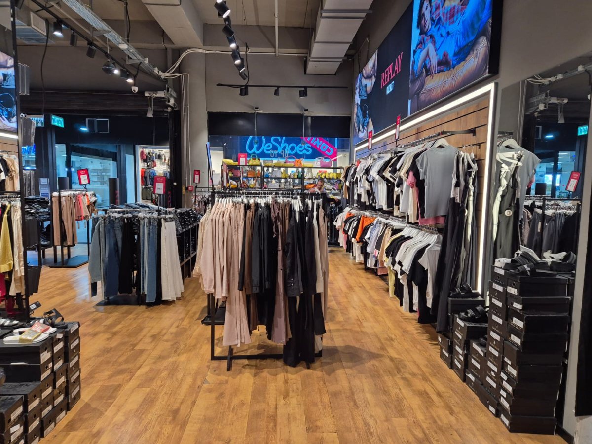 מגוון רחב של אופנת נשים וגברים – ג'ינסים, ברמודות, חולצות, טישרטים, תיקי נשים, הנעלה אופנתית, בגדי ים לגבר ולאישה ועוד בחנות האאוטלט הגדולה של replay בקניון עד הלום הצמוד לכניסה לאשדוד