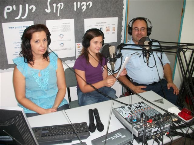 בתמונה: השוטר הקהילתי זאב קרפ, שהעביר הרצאה לתלמידי בית הספר "רננים" בתחום הגלישה הבטוחה בפורומים הכיתתיים באינטרנט, מתראיין בסוף ההרצאה באולפן החדשות של "קול רננים" על ידי התלמידה ניקול מטוסוויץ', מגישת המהדורה, והגב' ורד נטו עורכת המהדורה.