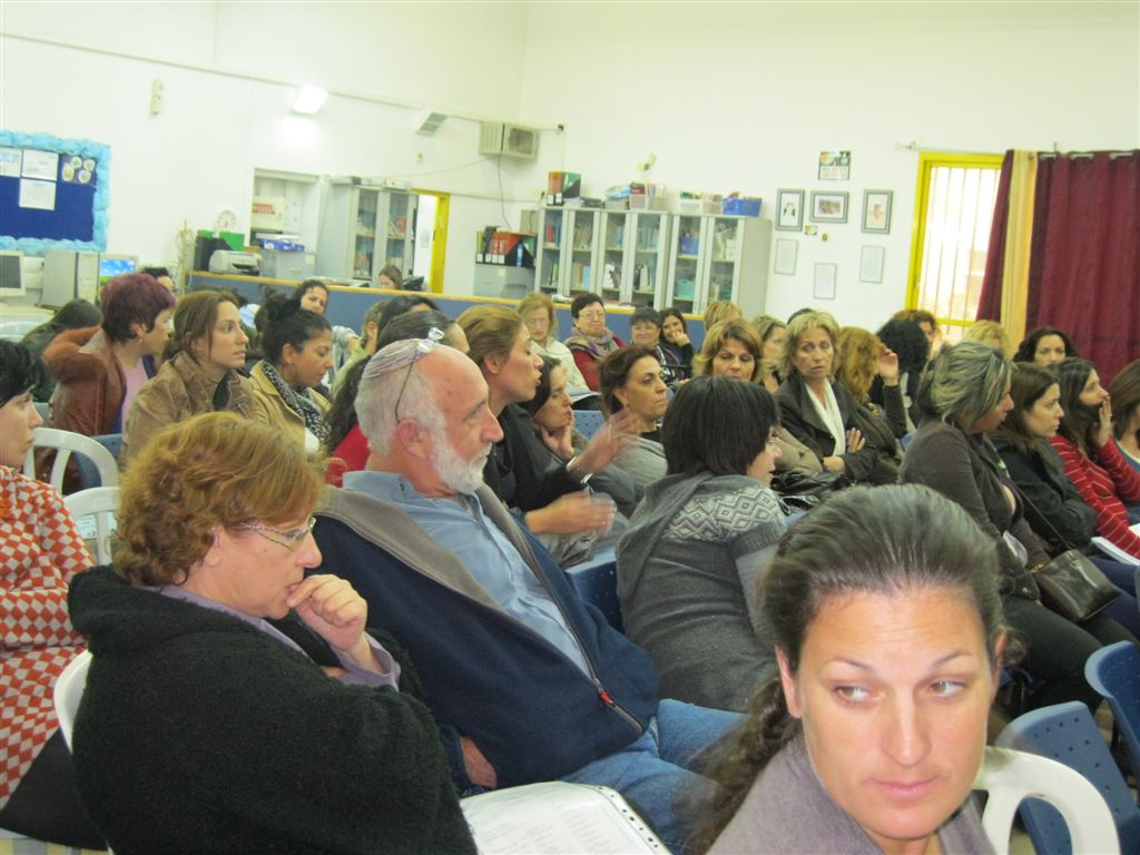 בהמשך התכנסו המורים בספריה, ע"ש תומר נוב ז"ל, והקשיבו להרצאה המאלפת של מר מורן אופק (הוועד למלחמה ברצח עם), אודות הרקע להיווצרות בעיית הפליטים בסודן והשלכותיה על מדינת ישראל. ההרצאה הייתה מלווה בסרטון מצמרר ובסיומה נוצר שיח ער בין המנחה למורים, ובינם לבין עצמם.