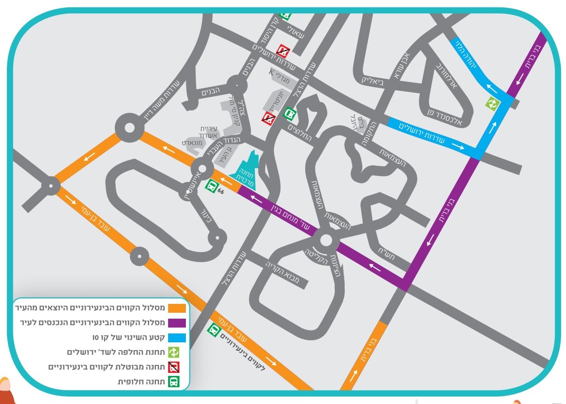 קווים עירוניים קווים מספר: 2 ,2א', 10 ,11 לכיוון נמל אשדוד/אזור תעשייה - רח' הבשם, לא ייכנסו לתחנה המרכזית, אלא יעצרו בתחנה בשד' הרצל/החלוצים - הסמוכה כ-200 מטר מן התחנה המרכזית. קו 66 לרכבת ישנה את מסלולו כך שעם הגעתו מחוף הקשתות לא יפנה שמאלה לרח' הגדוד העברי אלא ימשיך ישר על שד' בגין ויעצור בצמוד למתחם גן העיר (בגין /איינשטיין) הצמוד לתחנה המרכזית (לא יעצור בתוך התחנה). המסלול בחזור מתחנת הרכבת - יהיה ללא שינוי. קו 10 ישנה את מסלולו כך שיעבור בשד' ירושלים, יפנה שמאלה לשד' בני ברית, שמאלה לרח' יהודה הלוי ויעניק שירות במקום הקווים הבינעירוניים שמוסטים זמנית עקב העבודות.