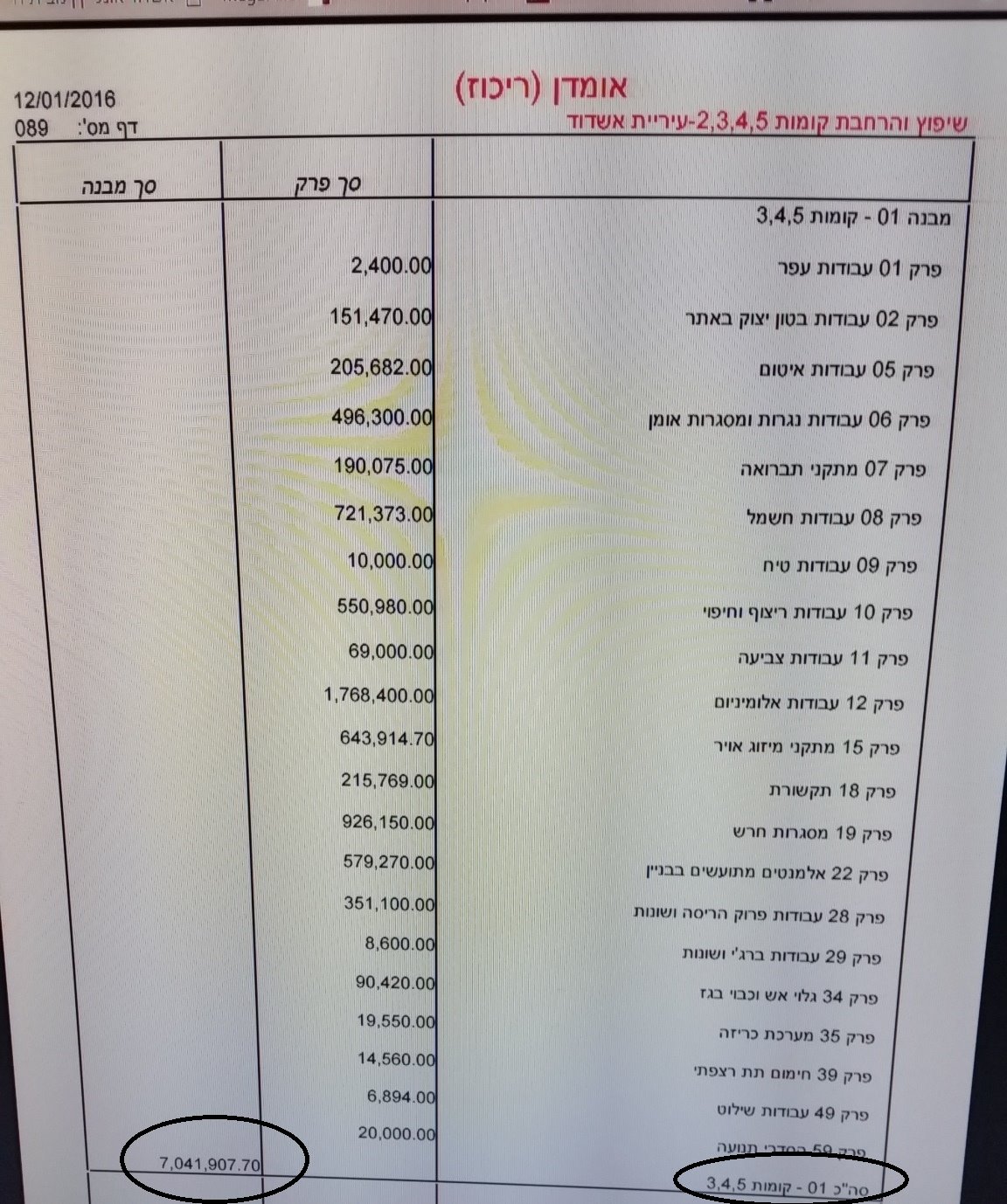 אומדן עלות העבודות על פי סעיפים, כפי שהופיעו במכרז לביצוע עבודות ההרחבה והשיפוץ. הקבלן הזוכה אמור היה לרשום בהצעתו כמה יוריד באחוזים מהאומדן: