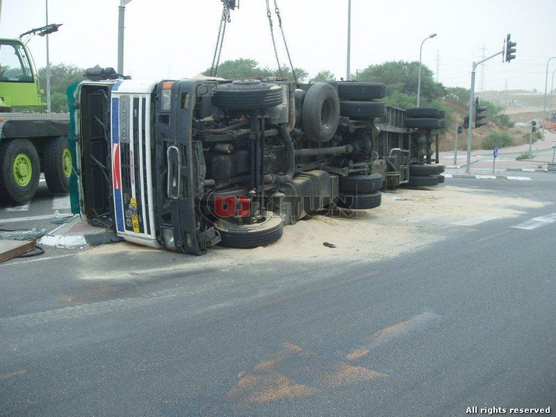 משאית עמוסה סחורות התהפכה היום בכביש הגישה החדש לנמל אשדוד. תוכננו 2 מסלולים ישירים לכניסה לנמל ומסלול בודד אחד לכניסה לעיר ,כאשר בכדי להכנס למסלול המפנה לעיר יש צורך לערוך עיקול חד שמאלה. נהג המשאית, ככול הנראה בגלל העיקול החד, איבד שליטה על משאיתו והתהפך. המשאית חסמה את הצומת ובמקום נוצר עומס כבד בגישה לנמל ובכניסה לעיר.
