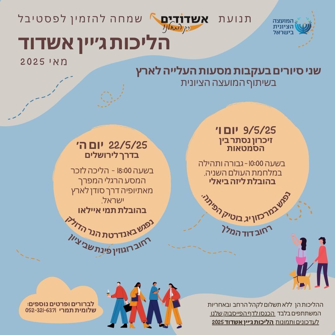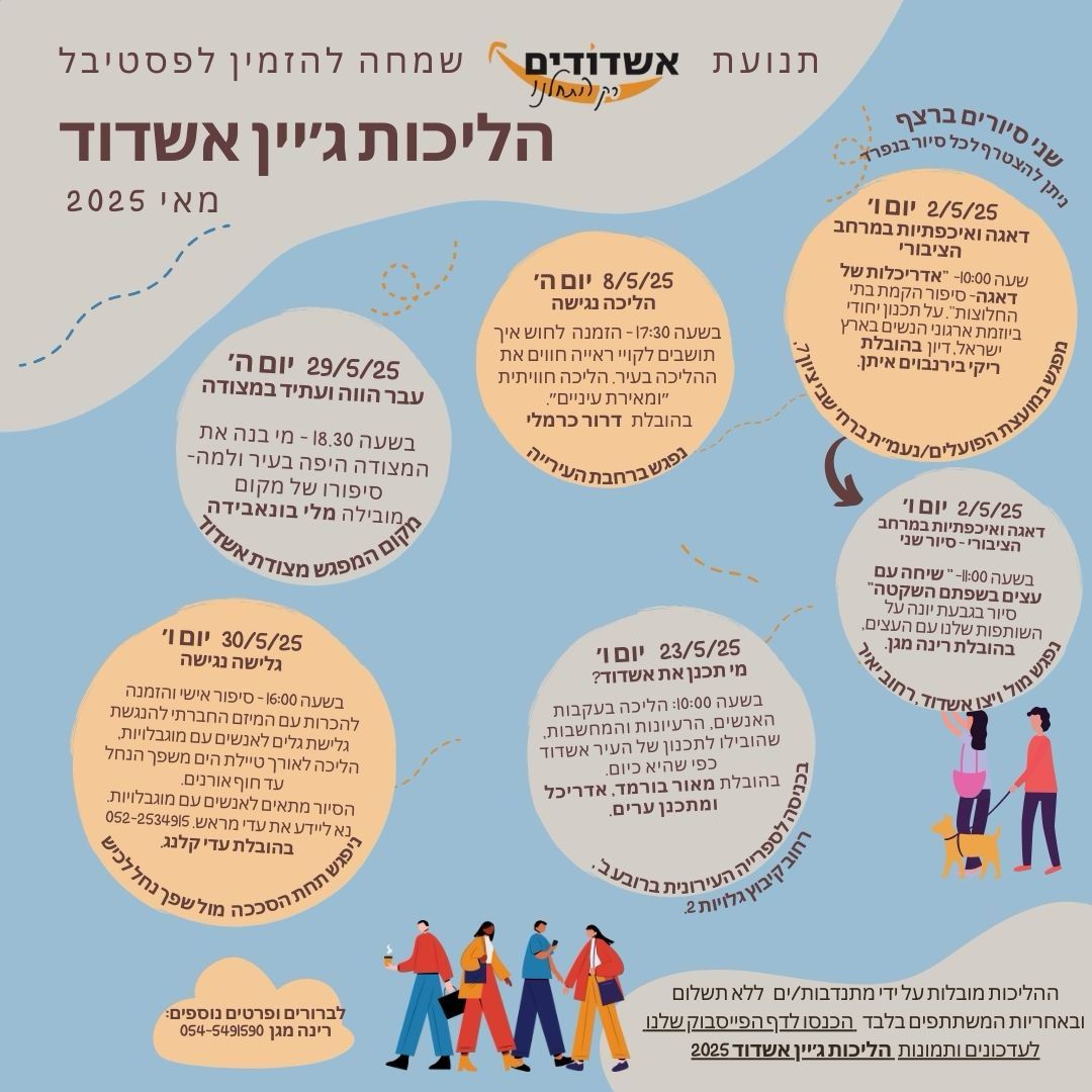 כ״ד אייר | 22.5 | 18:00 – “בדרך לירושלים” – מסע צעדת יהודי אתיופיה (תמי איילאו). כ״ה אייר | 23.5 | 10:00 – “מי תיכנן את אשדוד?” – סיור עם האדריכל מאור בורמד. כ״ט אייר | 29.5 | 18:30 – “עבר, הווה ועתיד במצודה” – מלי בונאבידה. א׳ סיוון | 30.5 | 16:00 – “גלישה נגישה” בחוף לכיש – מיזם חברתי בהובלת עדי קלנג (לפרטים: 052‑2534915).