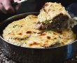 תבנית עגולה עם בשר טחון, ירקות וטחינה מוקרמת מעל. פיני מציע תחליף ל'על האש' המסורתי ומכין סנייה יוצאת דופן וקלה להכנה